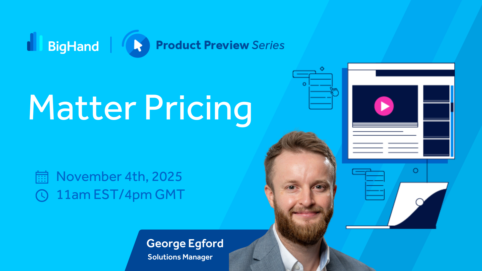 Informed by our most recent research, “Trends Analysis for Legal Pricing and Budgeting,” George Egford, Solutions Manager at BigHand, will delve into the critical shifts impacting the legal industry today. Our findings highlight the increasing demand for transparency, flexible pricing, and meticulous matter budgeting from clients, and we’re here to show you how BigHand Matter Pricing can meet these demands.