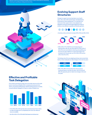 The latest legal research findings, from over 800 Operations, HR, Support Staff Management and Practice Group Leader roles in firms of 50+ lawyers in North America and the UK. This report outlines how to future proof legal services delivery with an efficient hybrid support structure, including the increase in support staff embracing hybrid working and structural changes to relieve pressure on support staff recruitment.