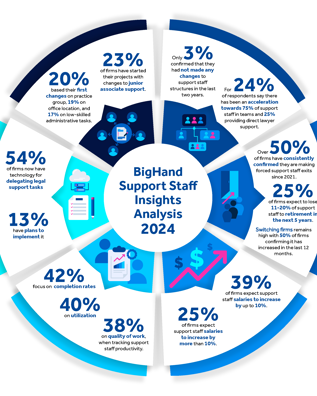 View the key findings from BigHand's research report around legal resourcing trends in this data wheel. Findings from over 800 legal management professionals, from law firms of 50+ lawyers, in the UK and North America.