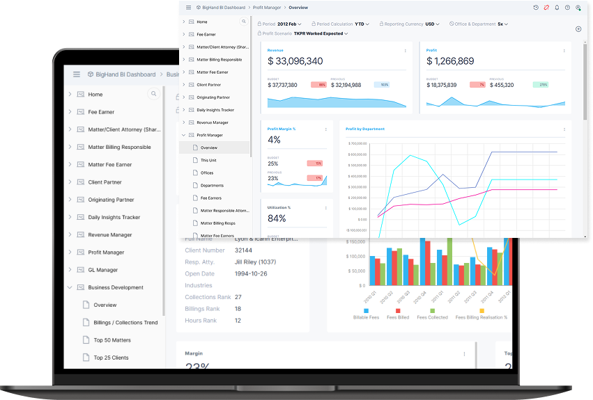BigHand’s Legal Business Intelligence is the most advanced BI solution for law firms. It’s a flexible, autonomous, and source-agnostic data warehouse solution that replaces manual law firm finance reporting with a real-time digital overview of your financial data.