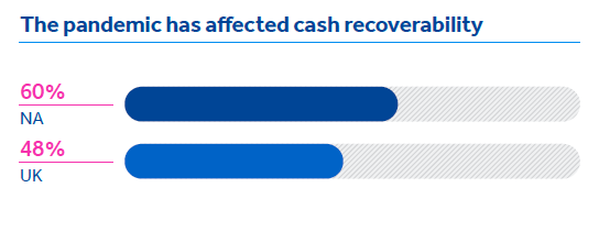 This year’s research, however, reveals a slightly different picture – although the challenges remain severe. Almost half (48%) of UK respondents said Aged Debt is an area of lock-up / inventory which has the biggest effect on the firm’s cash flow, while 42% (UK) said Aged WIP. In NA, the situation was reversed, with 48% citing Aged WIP, 41% Aged Debt. These findings underline the challenges not only in traditional cash management but also the new issues created by the pandemic – from client financial demands to the disconnect of dispersed teams working from home, finance teams have to consider new factors that are influencing working capital.