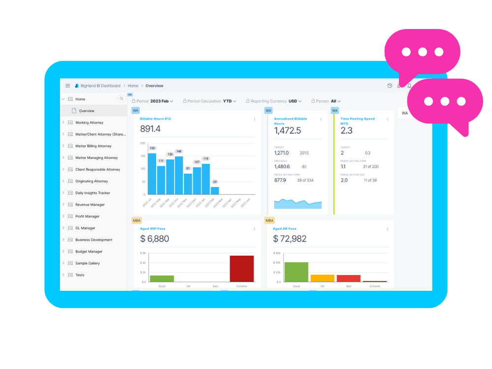 BigHand Business Intelligence (BI) allows your teams to grow your profit margin, improve cash flow and save crucial finance team time by helping them surface and analyze accurate financial data. With this insight, they can pinpoint and focus on high-profit activities, spot issues that could result in lower collections and provide cost transparency to grow client relationships.
